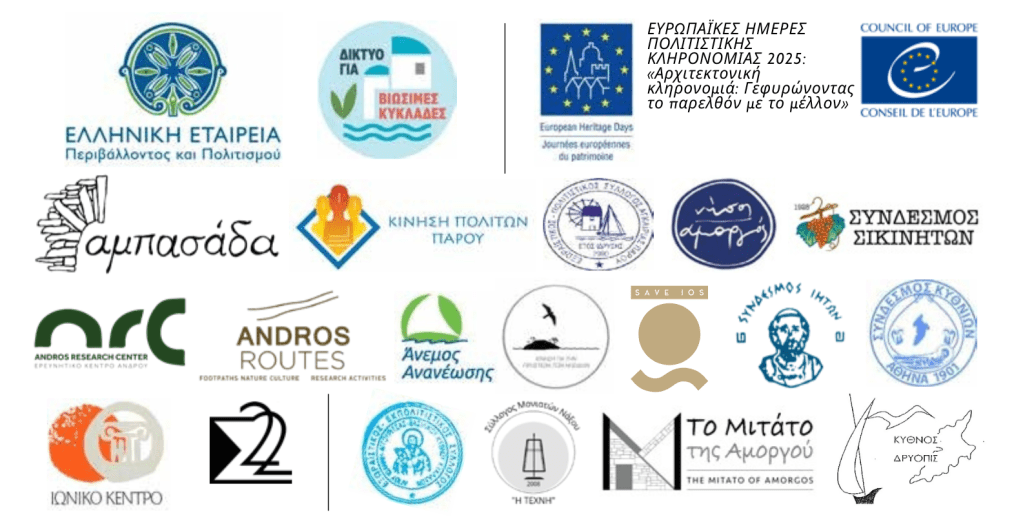 Αμπασάδα Τήνου • Andros Routes • Άνεμος Ανανέωσης Σίφνου • Δίκτυο για Βιώσιμες Κυκλάδες • Εκπολιτιστικός Σύλλογος Αγίου Ιωάννη Κύθνου • Ελληνική Εταιρεία Περιβάλλοντος και Πολιτισμού • Ερευνητικό Κέντρο Άνδρου • Κίνηση για την Προστασία των Νησίδων • Κίνηση Πολιτών Πάρου • Νήσος Αμοργός • Πολιτιστικός Σύλλογος Αγκαιριάς Πάρου • Save Ios • Σύλλογος Μονιατών Νάξου «Η Τέχνη» • Σύνδεσμος Δρυοπιδέων Κύθνου • Σύνδεσμος Ιητών • Σύνδεσμος Κυθνίων • Σύνδεσμος Σικινητών • Το Μιτάτο της Αμοργού