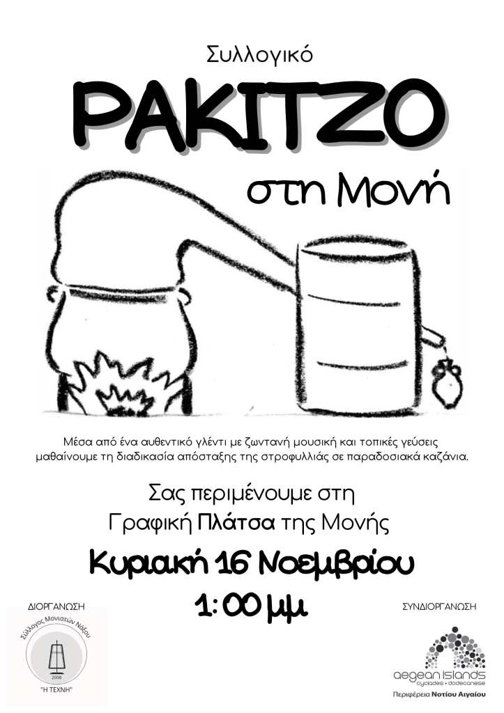 Ο Σύλλογος Μονιατών Νάξου «Η Τέχνη» και οι φίλοι μας, σε συνεργασία με την Περιφέρεια Νοτίου Αιγαίου, διοργανώνουμε την ετήσια γιορτή της ρακής στο χωριό μας.