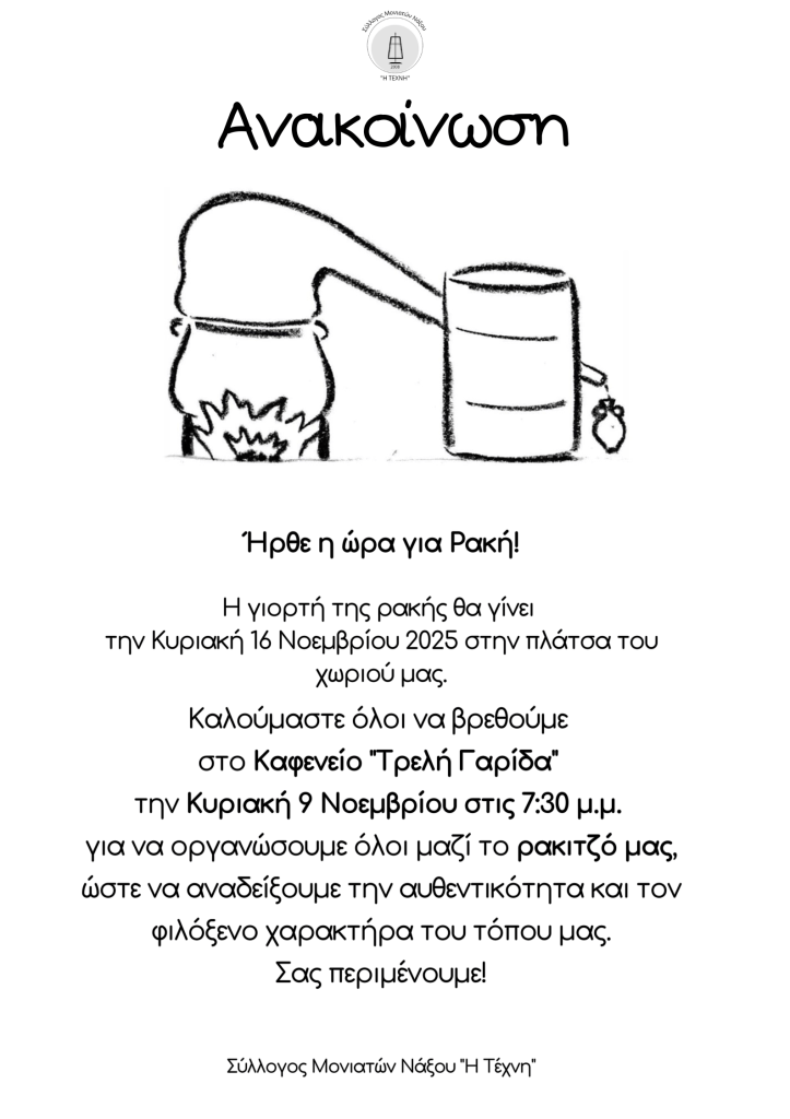 Η γιορτή της ρακής θα γίνει την Κυριακή 16 Νοεμβρίου 2025 στην πλάτσα του χωριού μας και πρέπει να οργανωθούμε…