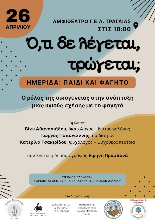 Η ημερίδα θα πραγματοποιηθεί την Κυριακή 26 Απριλίου 2026 στις 18:00, στο Αμφιθέατρο του Γενικού Λυκείου Τραγαίας, με ελεύθερη είσοδο για το κοινό. Μέσα από τις εισηγήσεις καταξιωμένων επιστημόνων, θα συζητηθούν σύγχρονες προσεγγίσεις για τη σωστή διατροφική ανάπτυξη και την ψυχολογική διάσταση της σίτισης. Στο πάνελ των ομιλητών θα συμμετέχουν η διαιτολόγος – διατροφολόγος Βίκυ Αθανασιάδου, ο παιδίατρος Γιώργος Παπαγιάννης και η ψυχολόγος ψυχοθεραπεύτρια Κατερίνα Τσακιρίδου. Τη συζήτηση θα συντονίσει η δημοσιογράφος Ειρήνη Προμπονά, ενώ για τη διευκόλυνση των οικογενειών θα παρέχεται δωρεάν δημιουργική απασχόληση για τα παιδιά στον χώρο της εκδήλωσης.